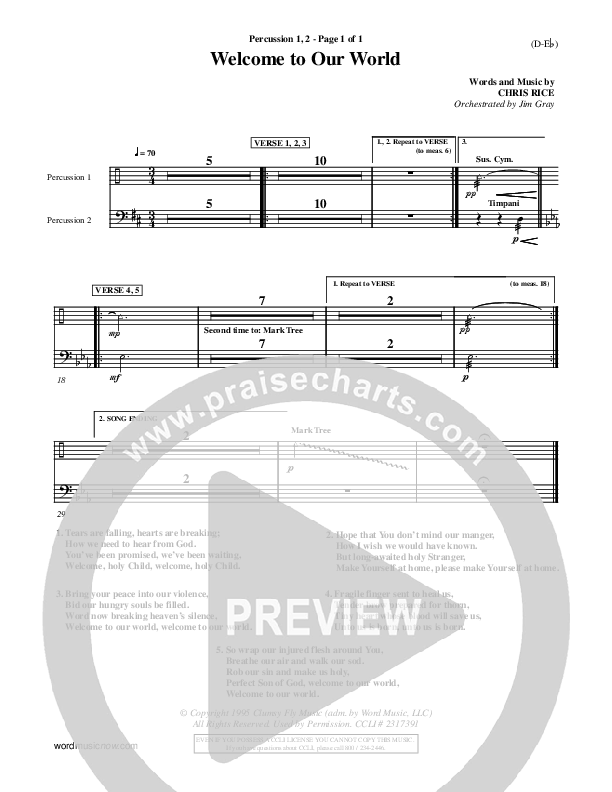 Download the Orchestration for Welcome To Our World by Chris Rice, from the album Word Music Now. This song was arranged by Jim Gray in the key of D, E.