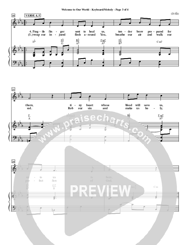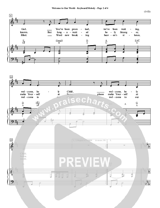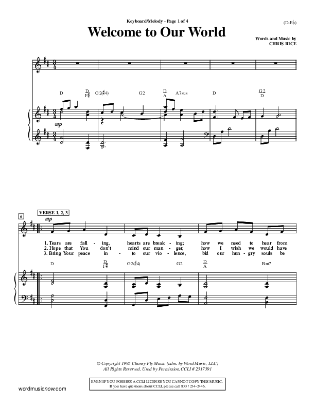 Download the piano sheet for Welcome To Our World by Chris Rice, from the album Word Music Now. This song was arranged by Jim Gray in the key of D, E.