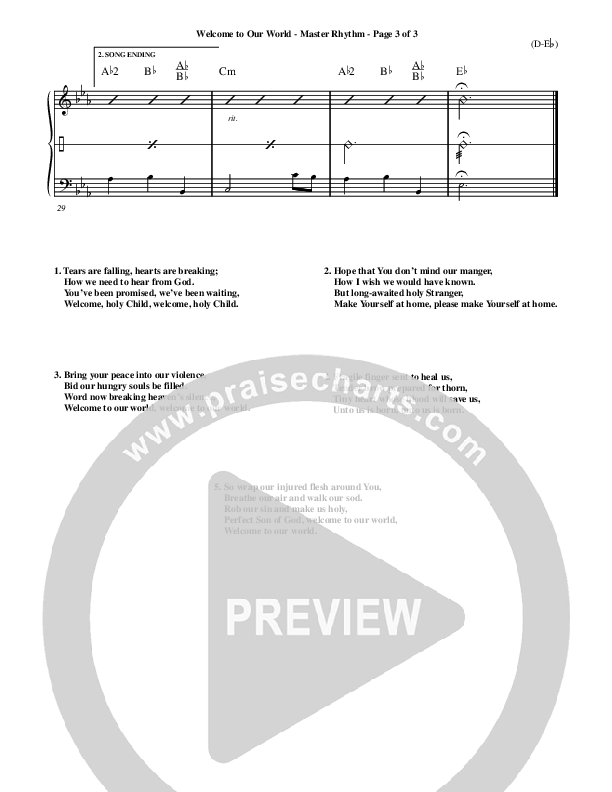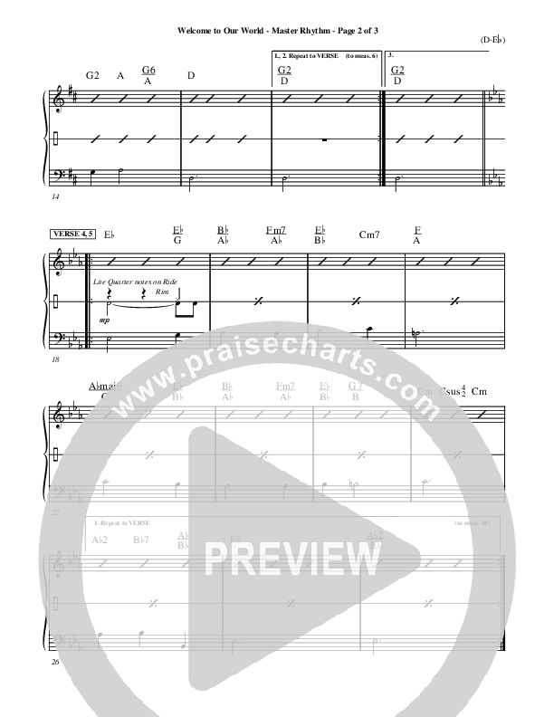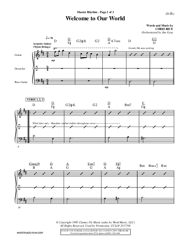Download the Rhythm Chart for Welcome To Our World by Chris Rice, from the album Word Music Now. This song was arranged by Jim Gray in the key of D, E.