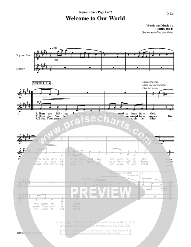 Download the Orchestration for Welcome To Our World by Chris Rice, from the album Word Music Now. This song was arranged by Jim Gray in the key of D, E.