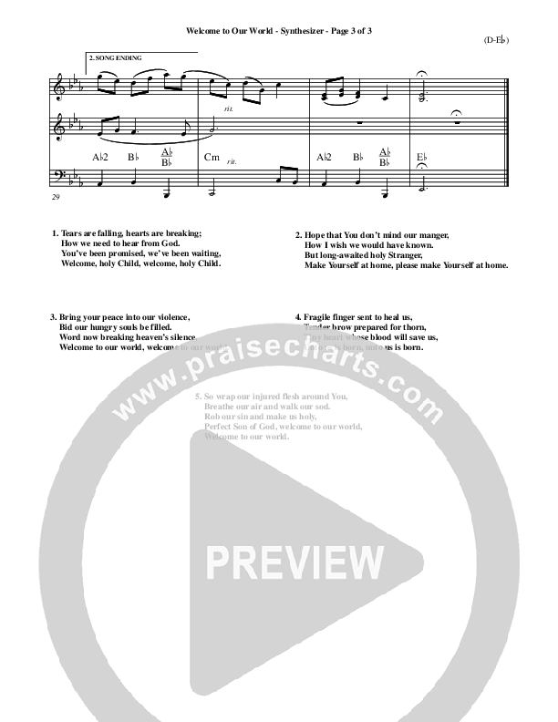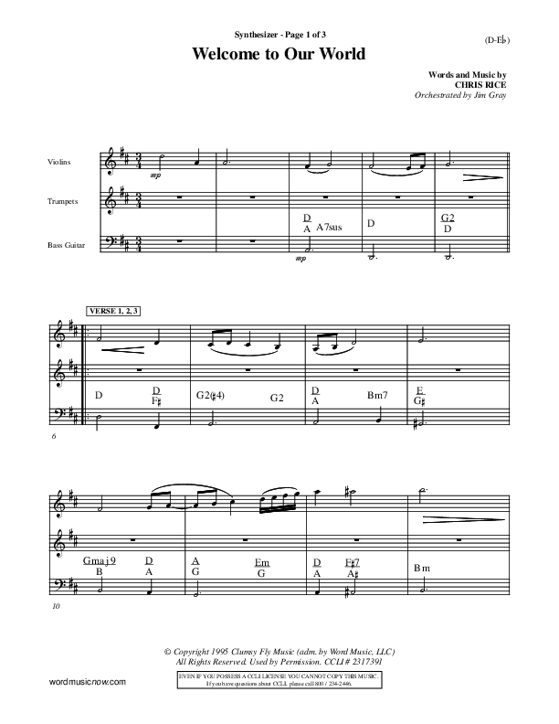Download the Orchestration for Welcome To Our World by Chris Rice, from the album Word Music Now. This song was arranged by Jim Gray in the key of D, E.