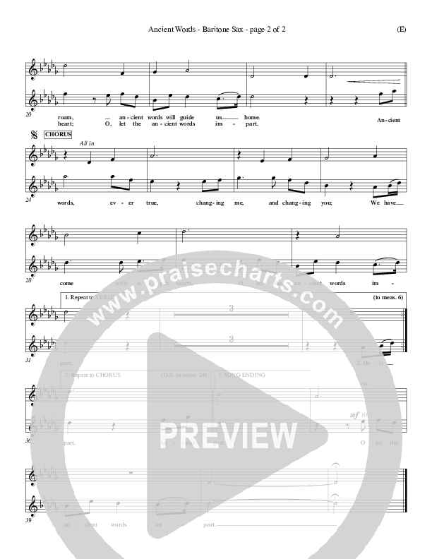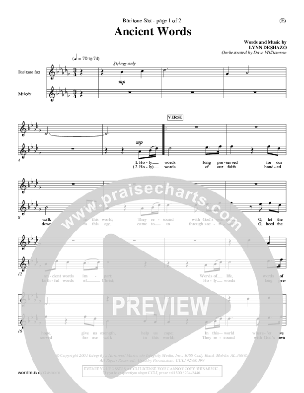 Download the Bari Sax sheet music for Ancient Words by Lynn DeShazo, from the album Word Music Now. This song was arranged by Dave Williamson in the key of E, F.