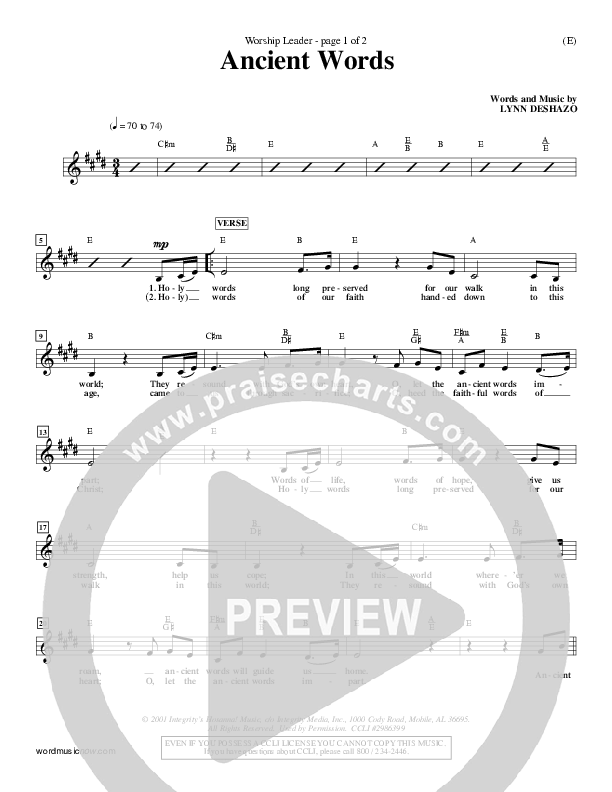 Download the Orchestration for Ancient Words by Lynn DeShazo, from the album Word Music Now. This song was arranged by Dave Williamson in the key of E, F.