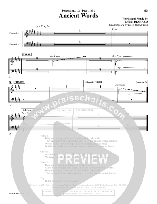 Download the Orchestration for Ancient Words by Lynn DeShazo, from the album Word Music Now. This song was arranged by Dave Williamson in the key of E, F.
