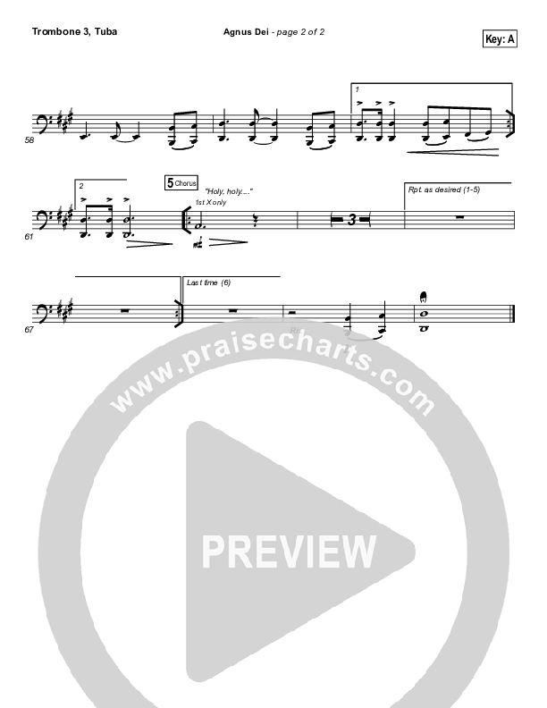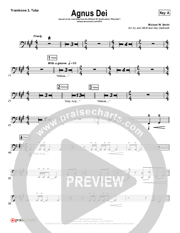 Download the Trombone 3/Tuba sheet music for Agnus Dei by Michael W. Smith, from the album Worship. This song was arranged by Joel Mott / Daniel Galbraith in the key of A, Bb.
