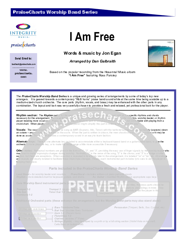 Download the Orchestration for I Am Free by New Life Worship, from the album Ross Parsley: I Am Free. This song was arranged by Daniel Galbraith in the key of D.