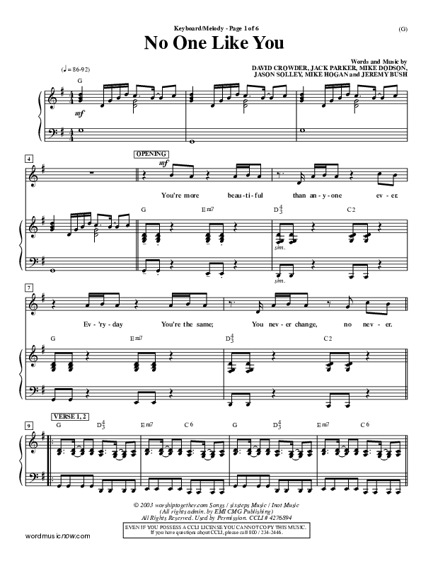 Download the sheet music for No One Like You by David Crowder, from the album Word Music Now.