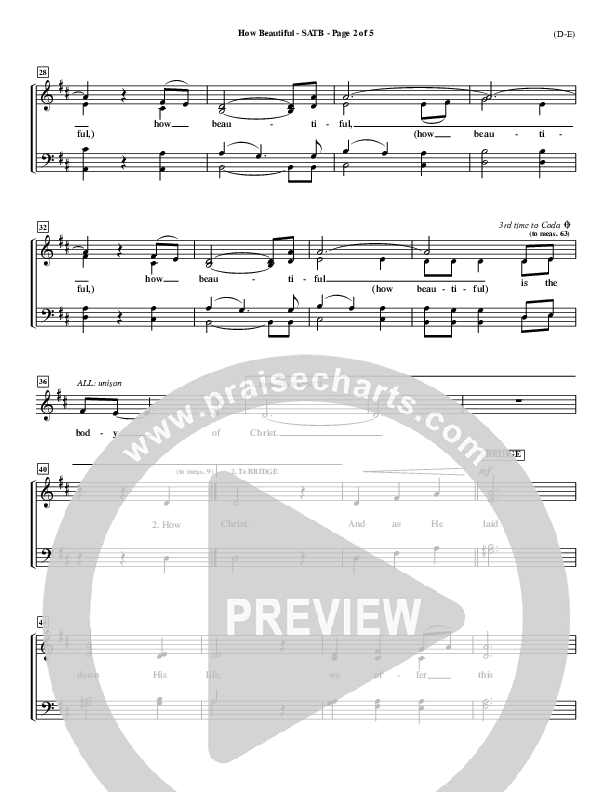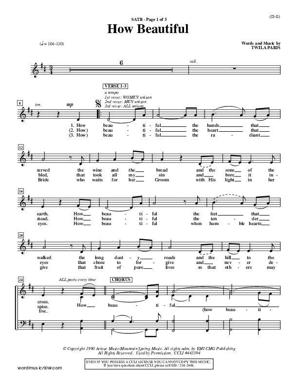 Download the Choir Sheet for How Beautiful by Twila Paris, from the album Word Music Now. This song was arranged by Billy Payne in the key of D, Eb.