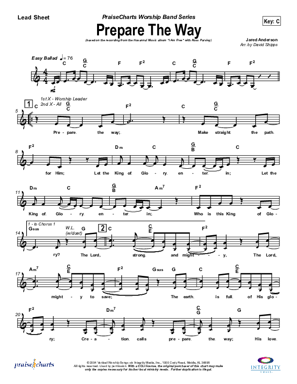 Download the sheet music for Prepare The Way by New Life Worship, from the album Ross Parsley: I Am Free. This song was arranged by David Shipps in the key of C, D.