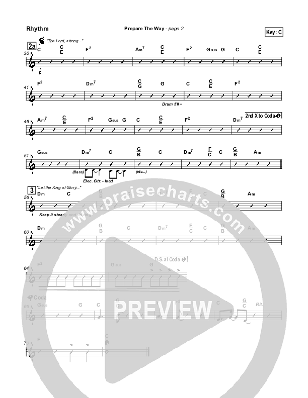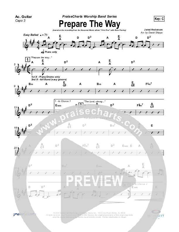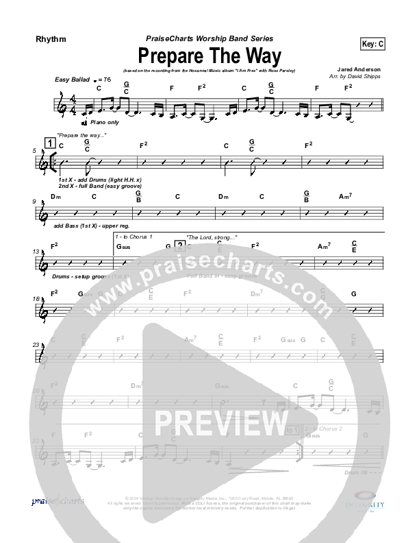 Download the Rhythm Chart for Prepare The Way by New Life Worship, from the album Ross Parsley: I Am Free. This song was arranged by David Shipps in the key of C, D.