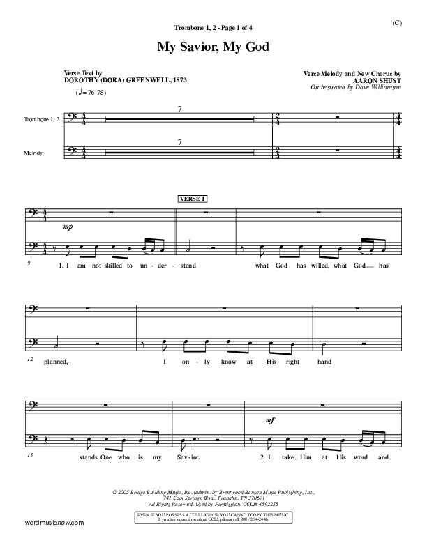 Download the Trombone 1,2 sheet music for My Savior My God by Aaron Shust, from the album Word Music Now. This song was arranged by Dave Williamson in the key of C, D.