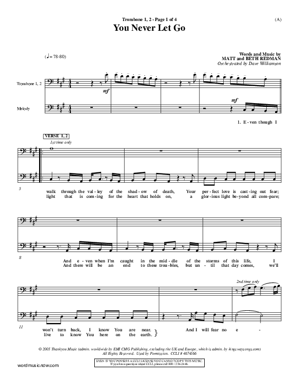 Download the Trombone 1,2 sheet music for You Never Let Go by Matt Redman, from the album Word Music Now. This song was arranged by Dave Williamson in the key of A, Bb.