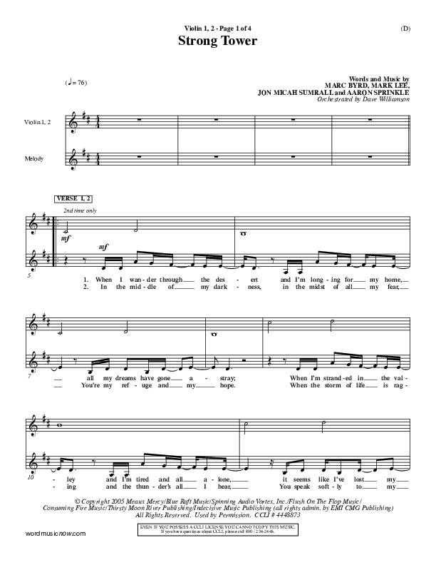 Download the Violin sheet music for Strong Tower by Kutless, from the album Word Music Now.