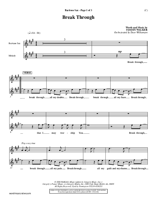 Download the Bari Sax sheet music for Break Through by Tommy Walker, from the album Word Music Now.
