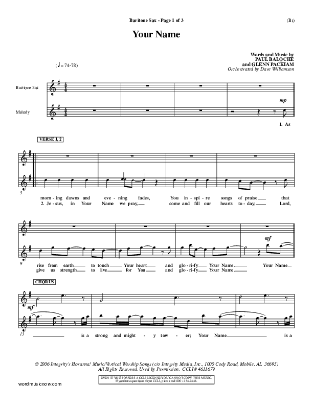 Download the Bari Sax sheet music for Your Name by Paul Baloche, from the album Word Music Now.