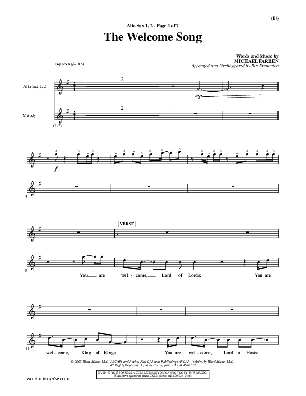 Download the Alto Sax 1,2 sheet music for The Welcome Song by Pocket Full Of Rocks, from the album Word Music Now.