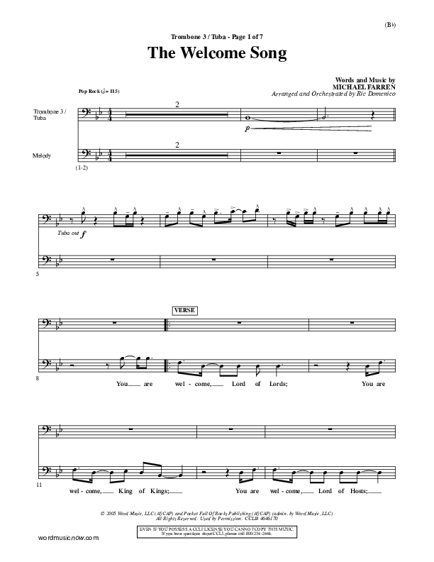 Download the Trombone 3/Tuba sheet music for The Welcome Song by Pocket Full Of Rocks, from the album Word Music Now.