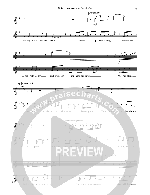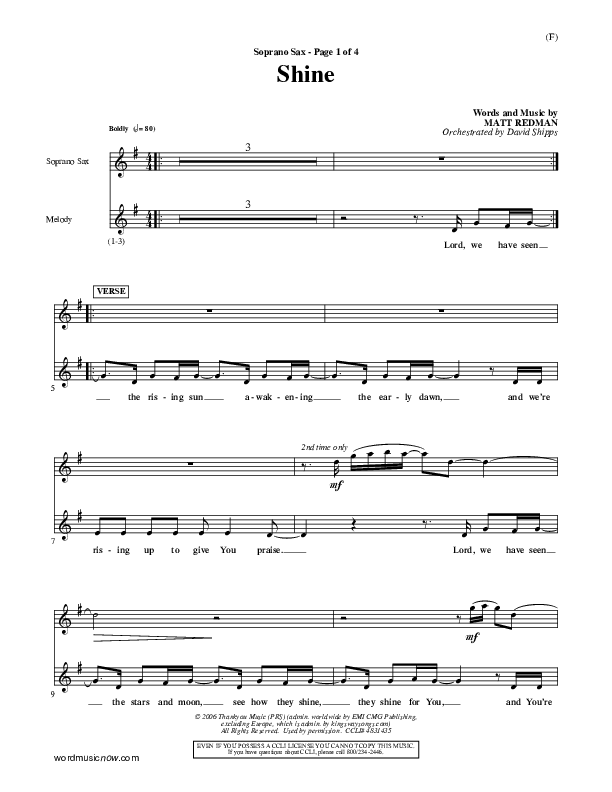 Download the Orchestration for Shine by Matt Redman, from the album Word Music Now. This song was arranged by David Shipps in the key of F, G.