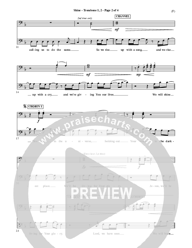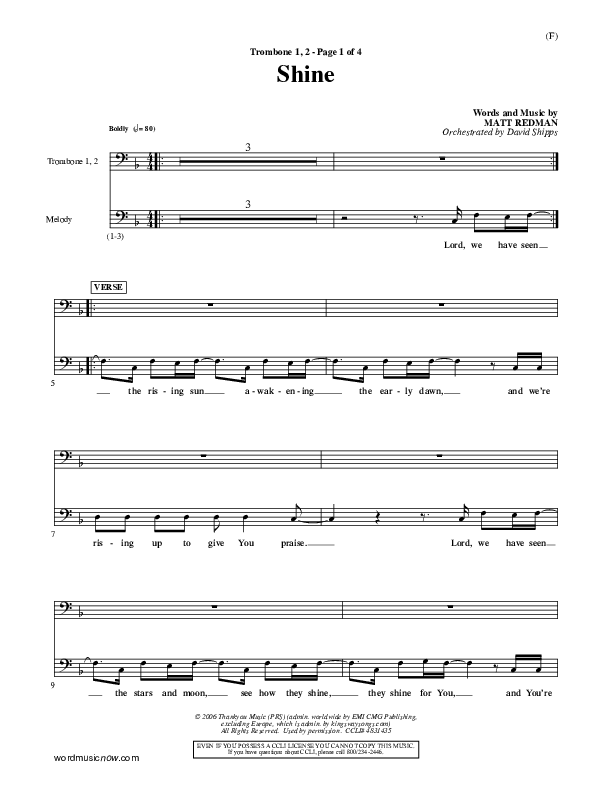 Download the Trombone 1,2 sheet music for Shine by Matt Redman, from the album Word Music Now. This song was arranged by David Shipps in the key of F, G.