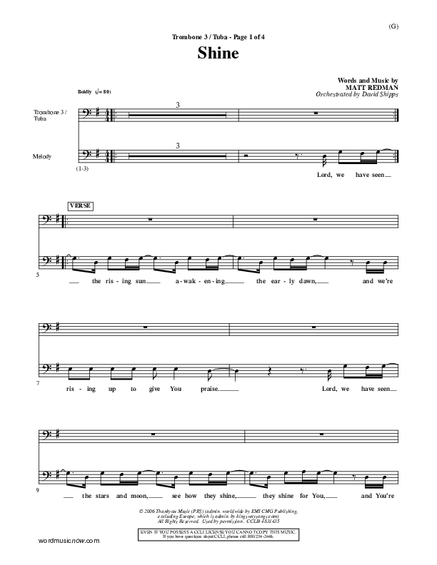 Download the Orchestration for Shine by Matt Redman, from the album Word Music Now. This song was arranged by David Shipps in the key of F, G.