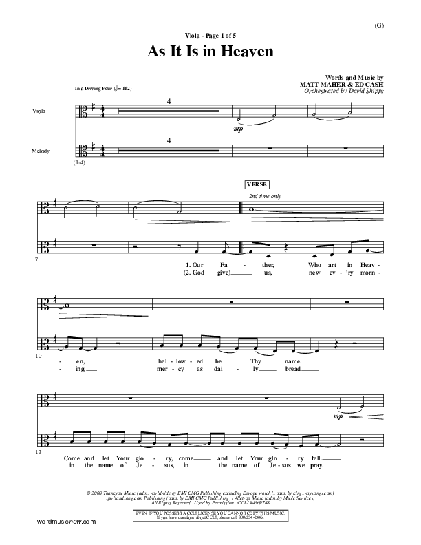 Download the Viola sheet music for As It Is In Heaven by Matt Maher, from the album Word Music Now.