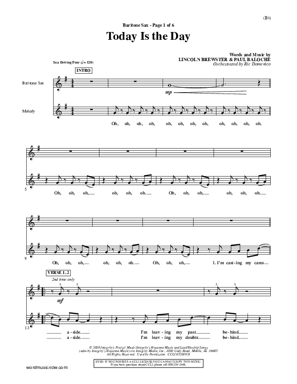 Download the Bari Sax sheet music for Today Is The Day by Lincoln Brewster, from the album Word Music Now.