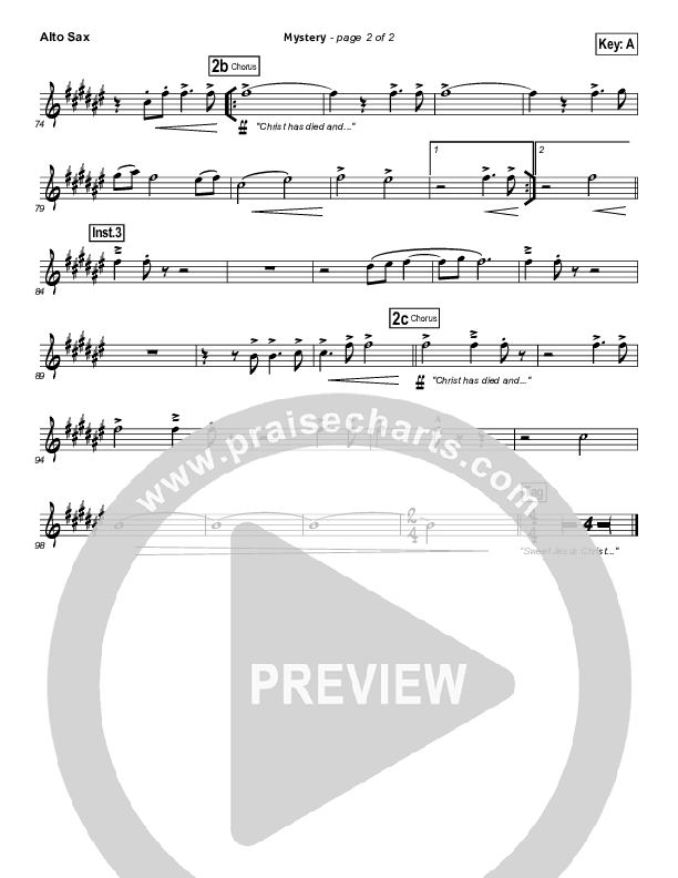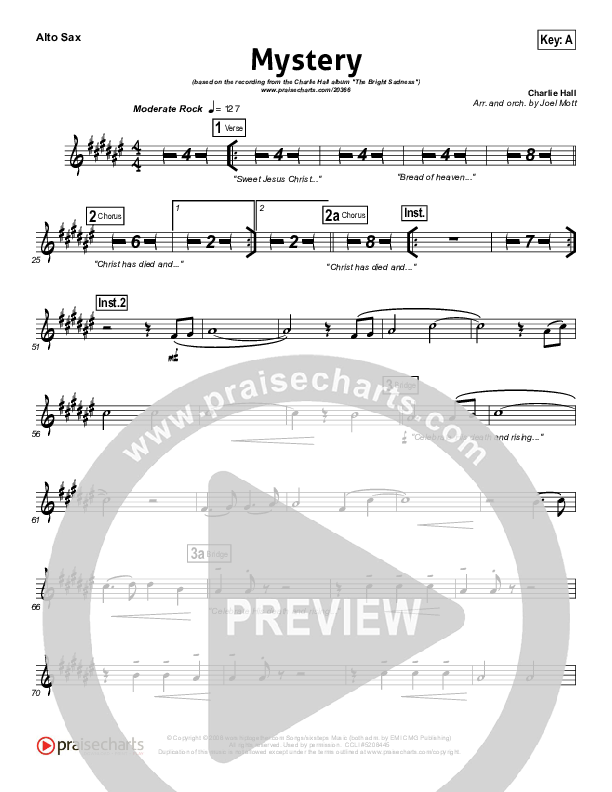 Download the AltoSax sheet music for Mystery by Charlie Hall, from the album The Bright Sadness. This song was arranged by Joel Mott in the key of A, G.