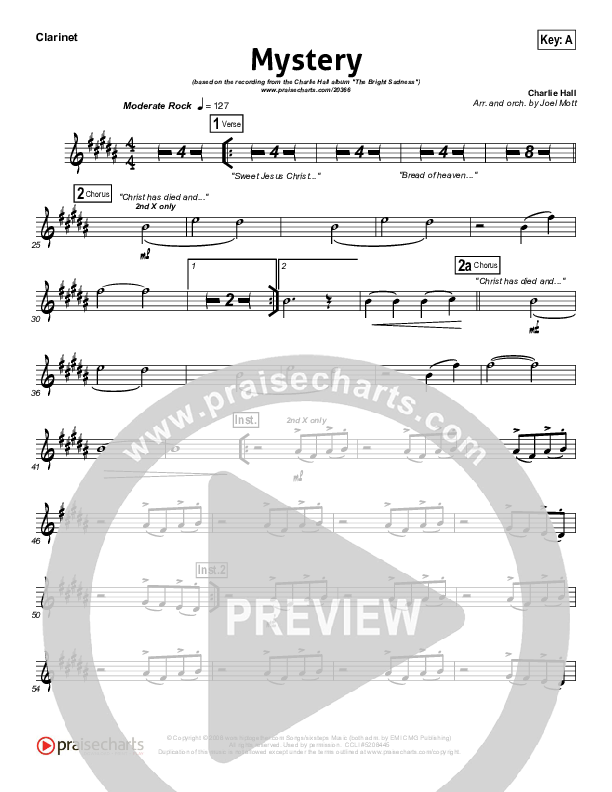 Download the Orchestration for Mystery by Charlie Hall, from the album The Bright Sadness. This song was arranged by Joel Mott in the key of A, G.