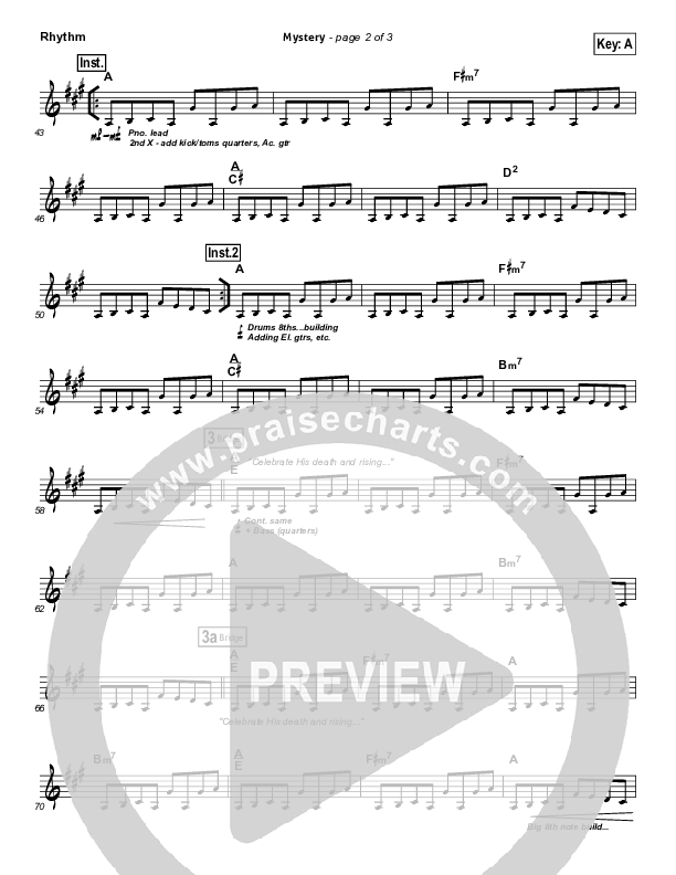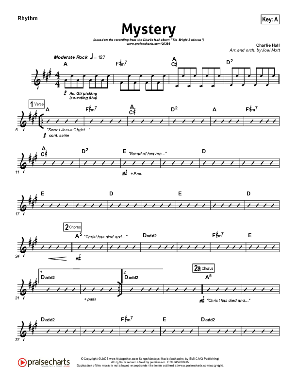 Download the Rhythm Chart for Mystery by Charlie Hall, from the album The Bright Sadness. This song was arranged by Joel Mott in the key of A, G.
