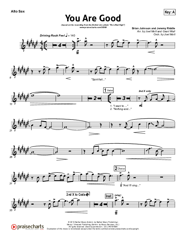 Download the AltoSax sheet music for You Are Good by Bethel Music, from the album Be Lifted High. This song was arranged by Joel Mott / Grant Wall in the key of A, G.