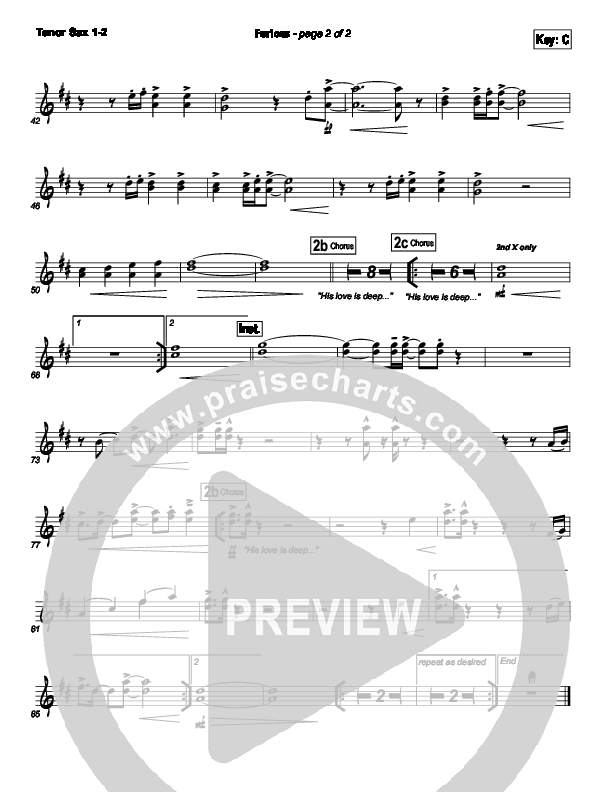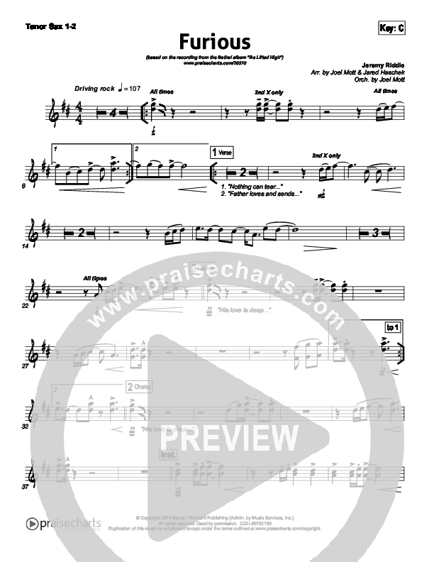 Download the Tenor Sax sheet music for Furious by Bethel Music, from the album Be Lifted High. This song was arranged by Joel Mott / Jared Haschek in the key of Bb, C.