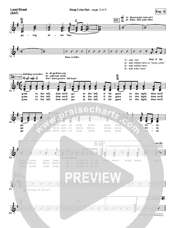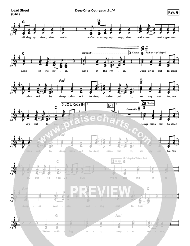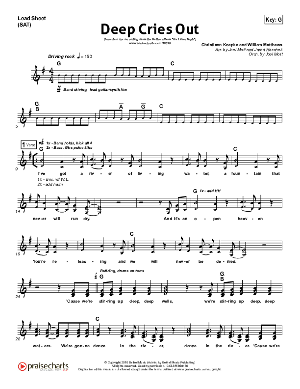 Download the sheet music for Deep Cries Out by Bethel Music, from the album Be Lifted High. This song was arranged by Joel Mott / Jared Haschek in the key of F, G.
