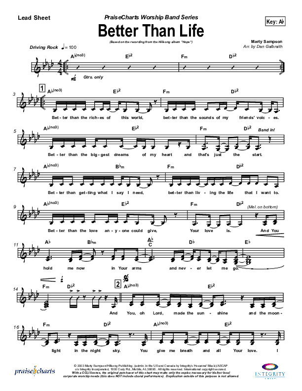 Download the Orchestration for Better Than Life by Hillsong Worship, from the album Hope. This song was arranged by Daniel Galbraith in the key of Ab, G.