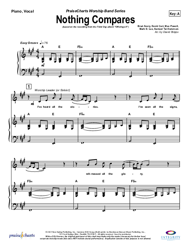 Download the sheet music for Nothing Compares by Third Day, from the album Offerings II. This song was arranged by David Shipps in the key of A, G.