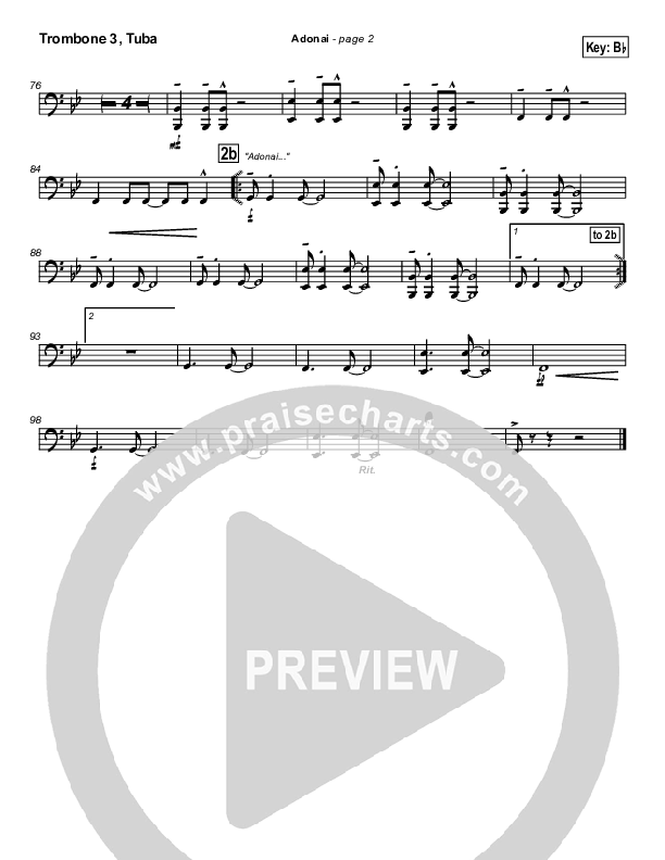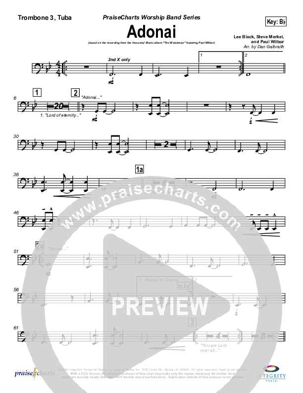 Download the Trombone 3/Tuba sheet music for Adonai by Paul Wilbur, from the album The Watchman. This song was arranged by Daniel Galbraith in the key of Bb, C.