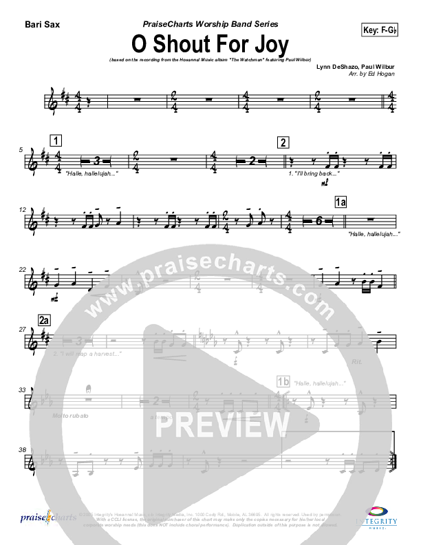 Download the Bari Sax sheet music for O Shout For Joy by Paul Wilbur, from the album The Watchman. This song was arranged by Ed Hogan in the key of G.