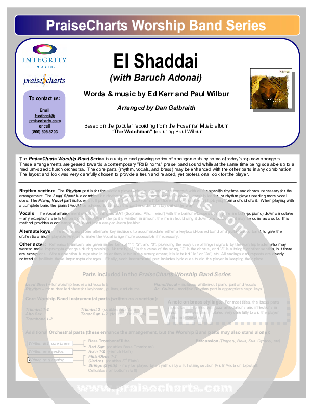 Download the Orchestration for El Shaddai (with Baruch Adonai) by Paul Wilbur, from the album The Watchman. This song was arranged by Daniel Galbraith in the key of Em.