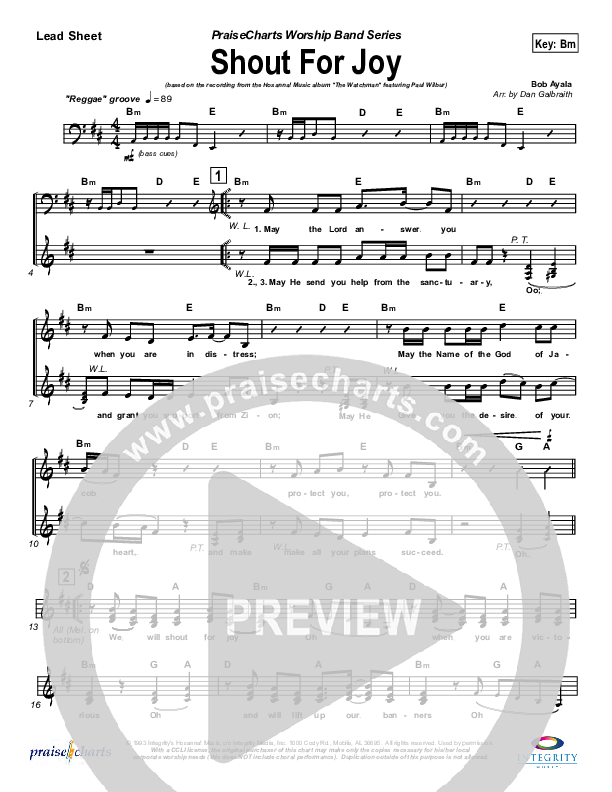 Download the Orchestration for Shout For Joy by Bob Ayala, from the album The Watchman. This song was arranged by Daniel Galbraith in the key of Cm.
