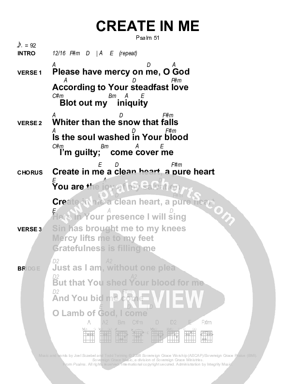 Download the PDF Chord Charts for Create In Me by Sovereign Grace, from the album Psalms.
