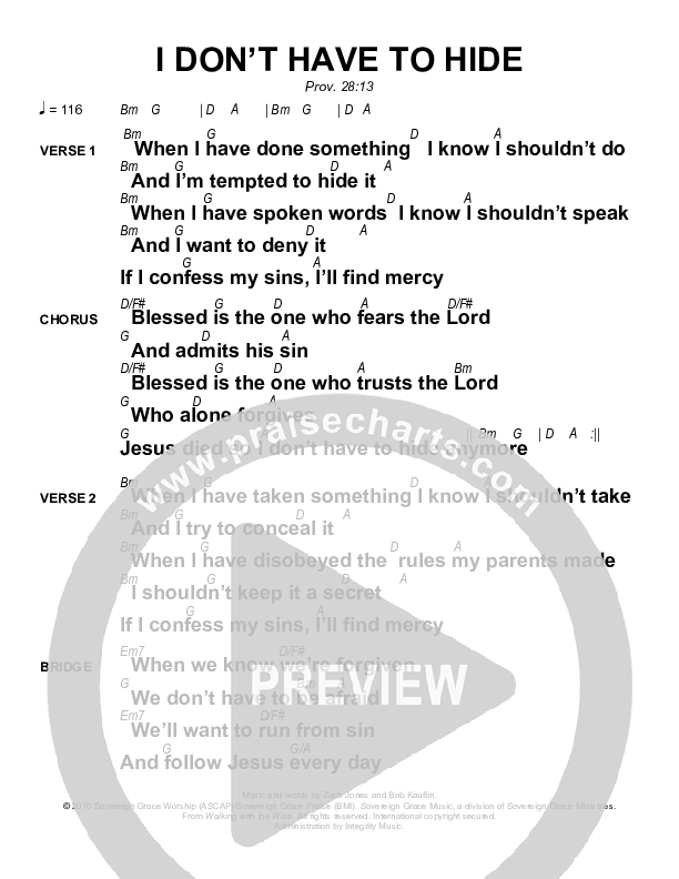 Download the PDF Chord Charts for I Don't Have To Hide by Sovereign Grace, from the album Walking With The Wise.