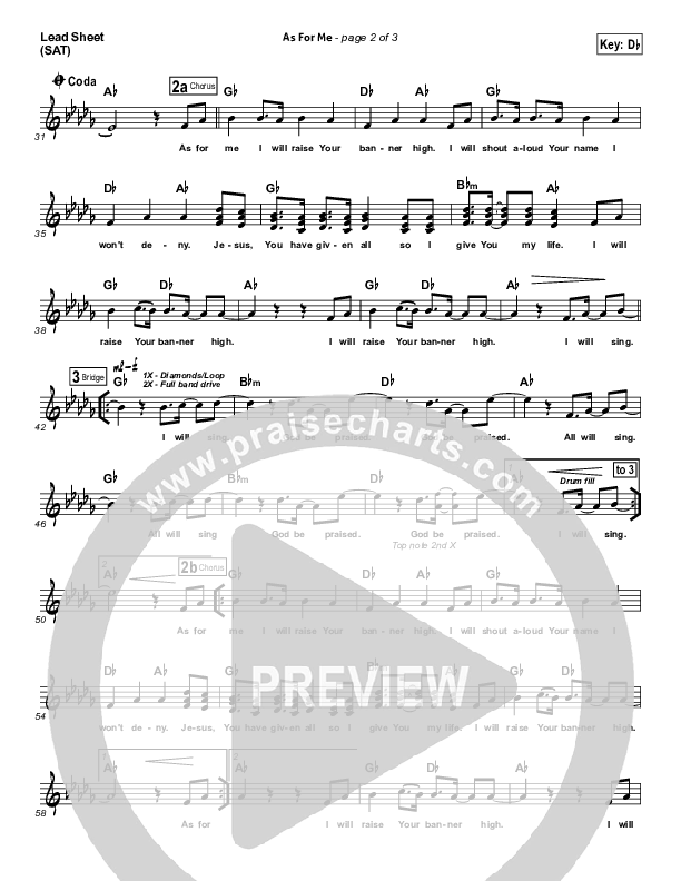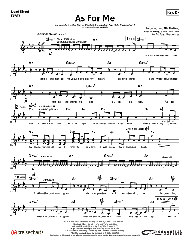 Download the sheet music for As For Me by One Sonic Society, from the album Society - EP. This song was arranged by Brad Henderson in the key of D, Db.