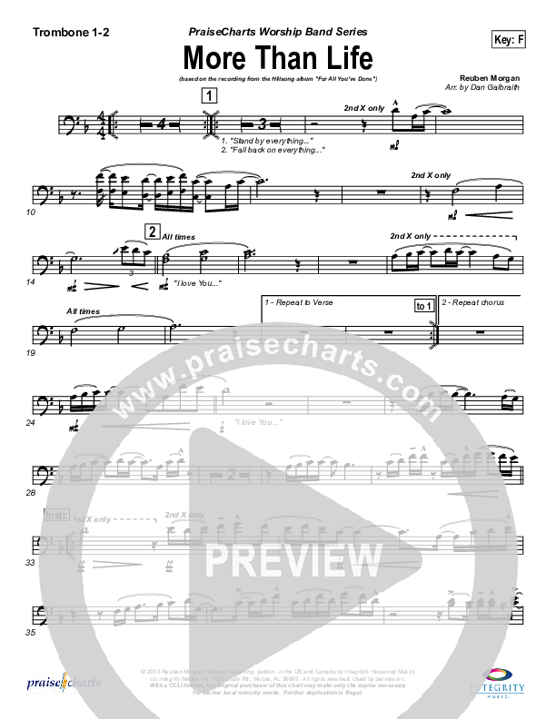 Download the Trombone 1,2 sheet music for More Than Life by Hillsong Worship, from the album For All You've Done. This song was arranged by Daniel Galbraith in the key of F, G.
