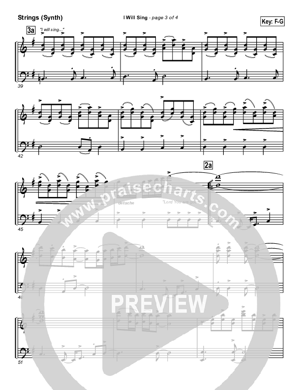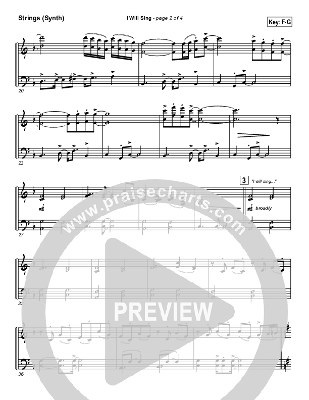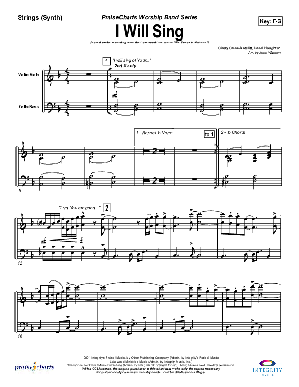 Download the Orchestration for I Will Sing by Lakewood Church, from the album Lakewood Live: We Speak to Nations. This song was arranged by John Wasson in the key of F, Gb.