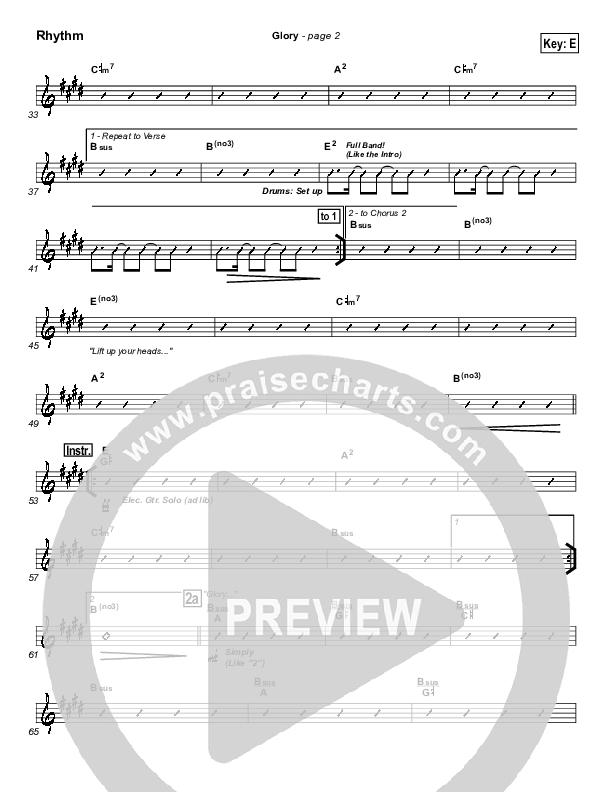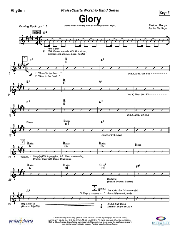 Download the Rhythm Chart for Glory by Hillsong Worship, from the album Hope. This song was arranged by Ed Hogan in the key of E, Eb.