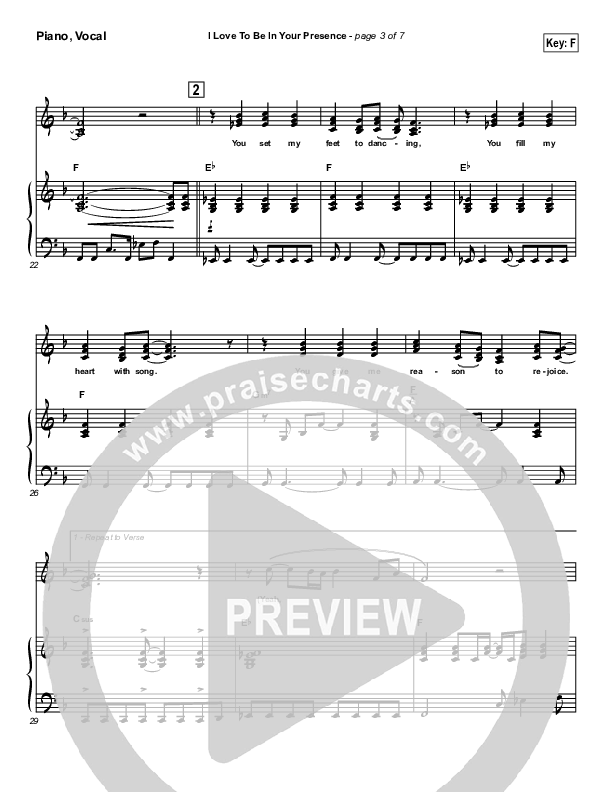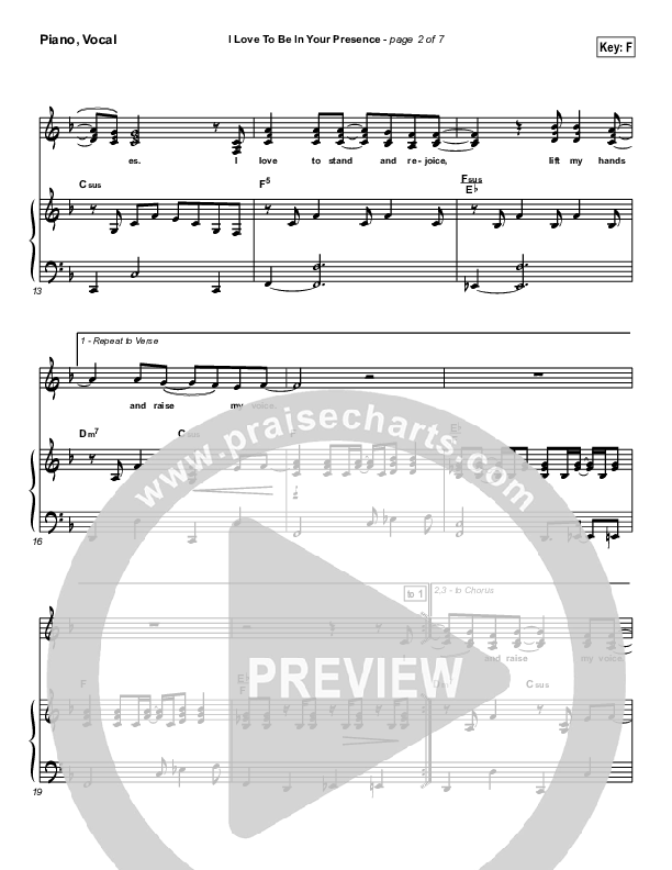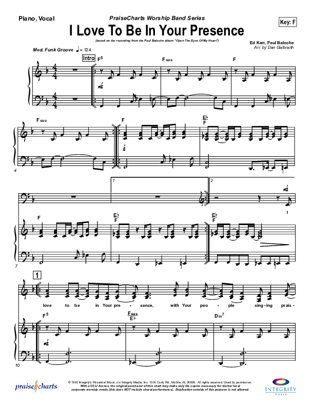 Download the sheet music for I Love To Be In Your Presence by Paul Baloche, from the album Open The Eyes of My Heart. This song was arranged by Daniel Galbraith in the key of F, G.