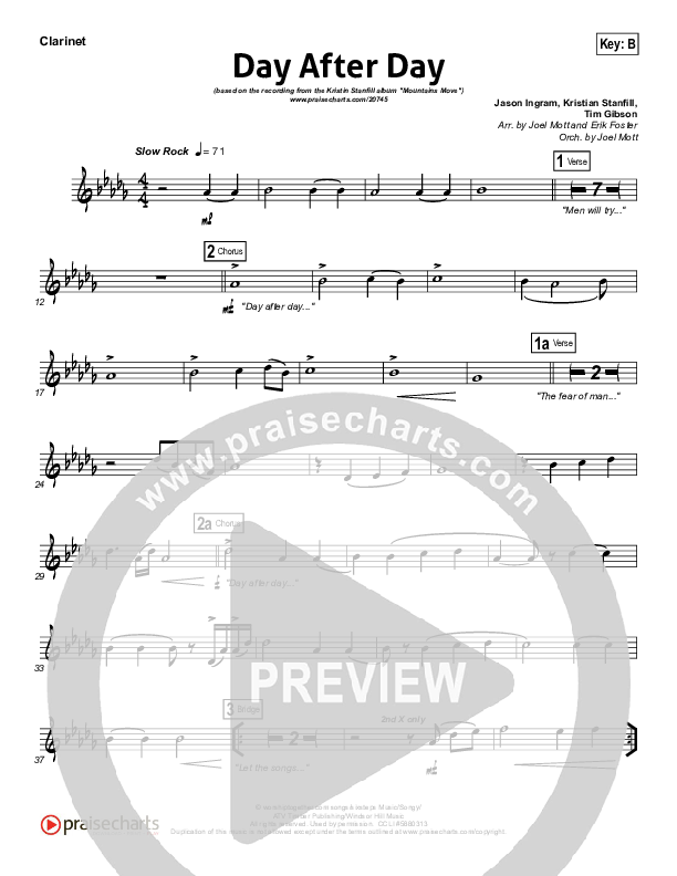 Download the Orchestration for Day After Day by Kristian Stanfill, from the album Mountains Move. This song was arranged by Joel Mott / Erik Foster in the key of B, C.