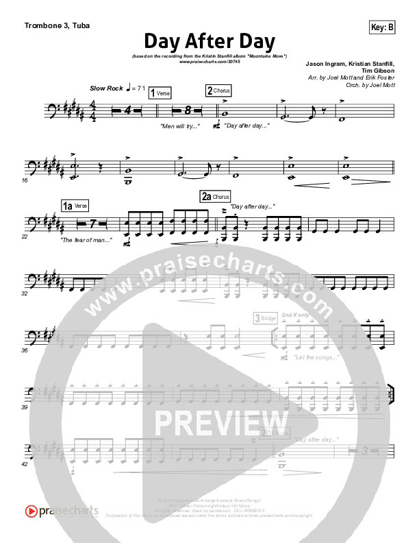 Download the Trombone 3/Tuba sheet music for Day After Day by Kristian Stanfill, from the album Mountains Move. This song was arranged by Joel Mott / Erik Foster in the key of B, C.