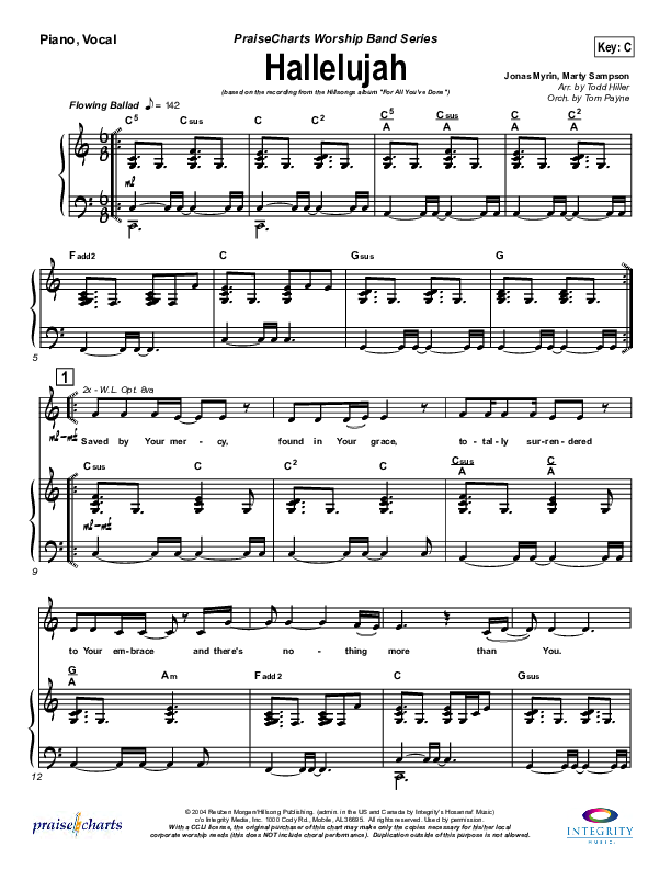 Download the sheet music for Hallelujah by Hillsong Worship, from the album For All You've Done. This song was arranged by Todd Hiller / Tom Payne in the key of Bb, C.