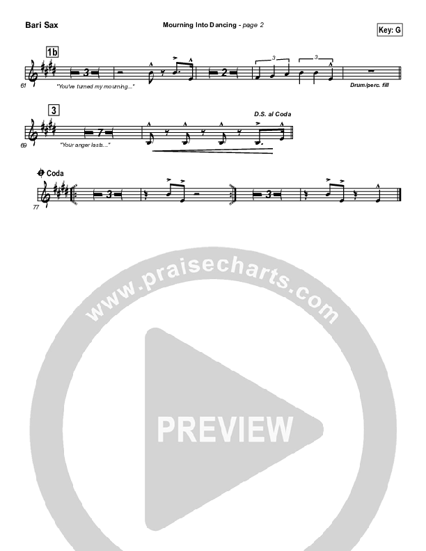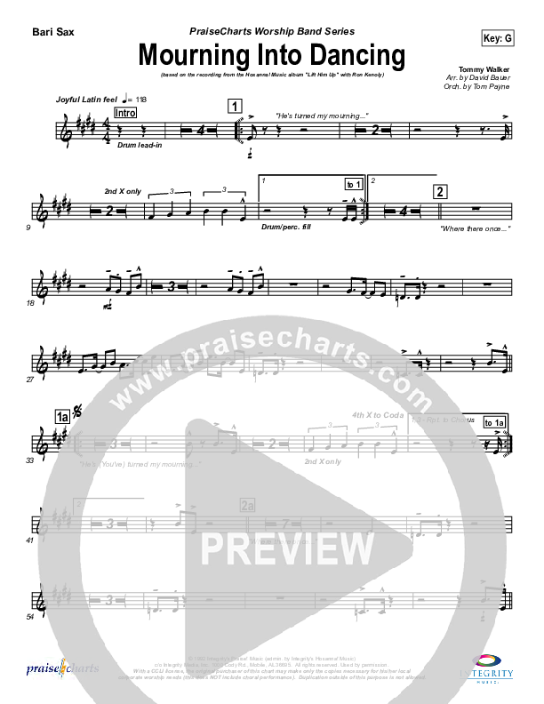 Download the Bari Sax sheet music for Mourning Into Dancing by Tommy Walker, from the album Lift Him Up. This song was arranged by David Bauer / Tom Payne in the key of F, G.