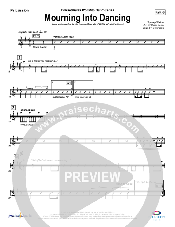 Download the percussion sheet music for Mourning Into Dancing by Tommy Walker, from the album Lift Him Up. This song was arranged by David Bauer / Tom Payne in the key of F, G.